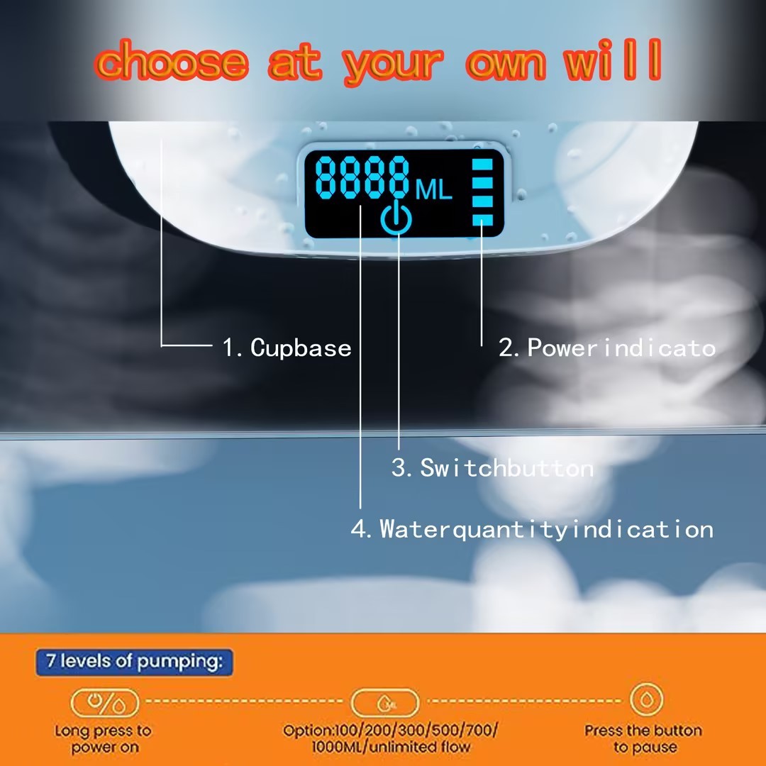 1. 【Smart】Smart with 8 levels of quantitative pumping, 8-stage capacity selection with indicator light (100ml, 200ml, 300ml, 500ml, 700ml, 1000ml, and unlimited flow), the electric water dispenser is suitable for various types of bottles (1~5 gallon).